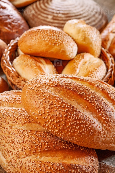Свежий хлеб. В ассортименте хлебобулочных изделий буханки хлеба и рулоны