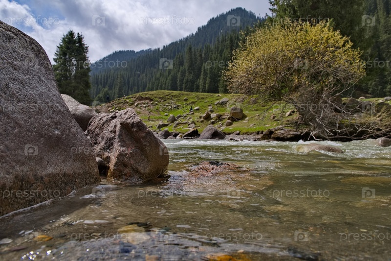 Кыргызстан, восточный берег озера Иссык-Куль. Вид на нагромождения скал и огромных камней в долине реки Арашан