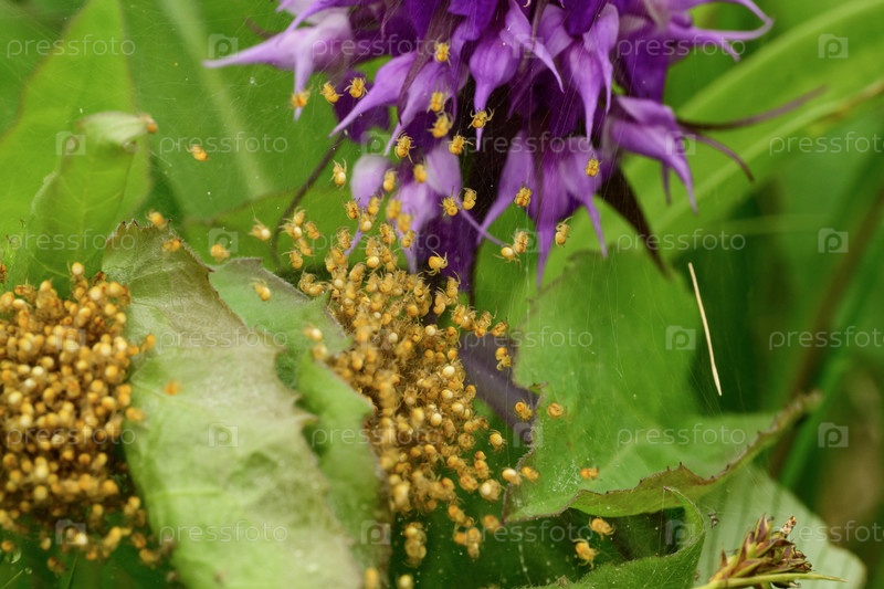 Колония молодых пауков в паутине