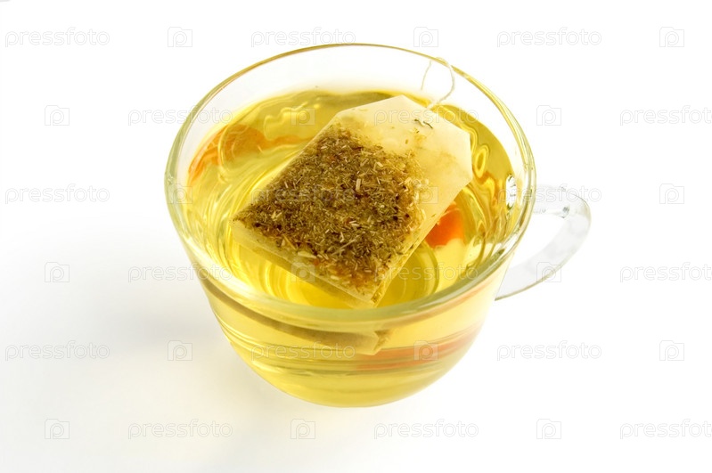 Пакетик зеленого травяного чая в стеклянной чашке с водой