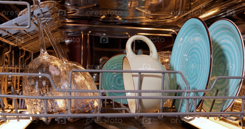 Открытая посудомоечная машина с чистой посудой. Концепция домашнего хозяйства