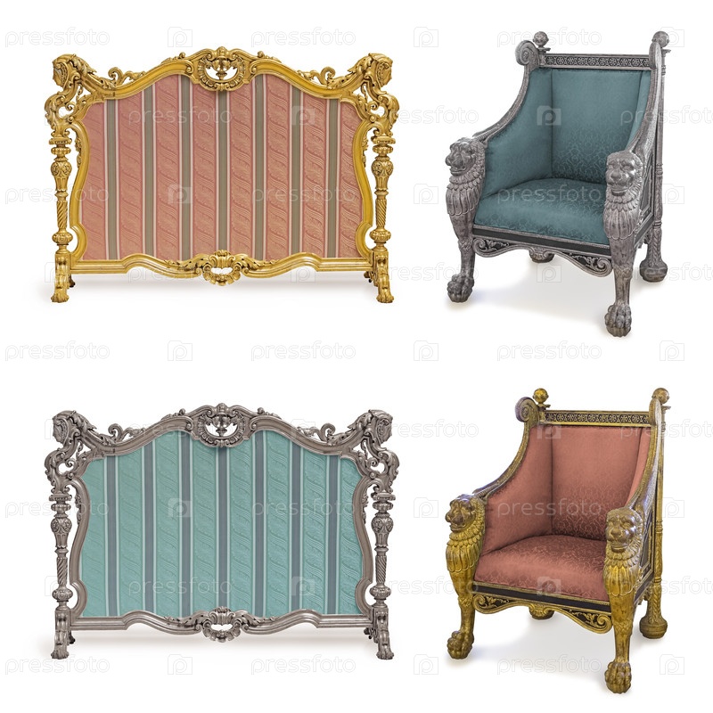 Древнее золотое и серебряное кресло и экран огня изолированы на белом фоне