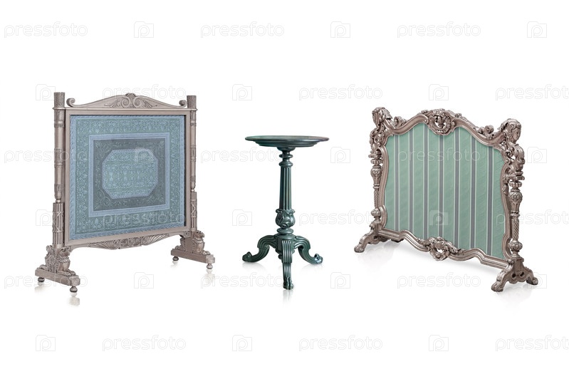 Серебряные экраны огня и деревянный круглый стол изолированы на белом фоне