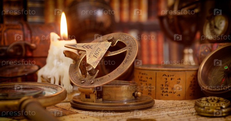 Винтажный стиль путешествий и приключений. Старинный компас и другие старинные предметы на столе