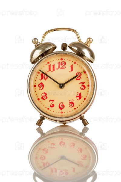 Старый аналоговый будильник на белом фоне