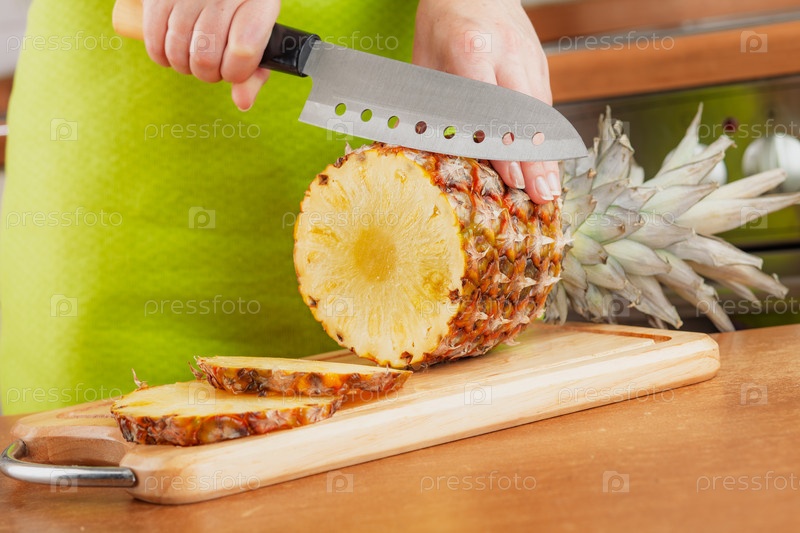 Женщина нарезает свежий ананас на разделочной доске