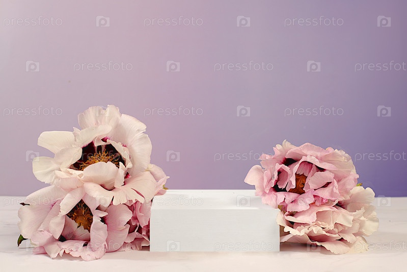 Пустой подиум с весенними горными цветами пиона. Абстрактное цветочное обустройство с пионами, баннером. Креативный шаблон для вашего дизайна. Минимальная современная эстетика, элегантная концепция красоты,