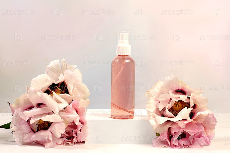 Рекламная карточка спа-салона. Оздоровительная композиция с сиреневой водой и свежими цветами горного пиона, концепция естественного самообслуживания и здорового образа жизни, абстрактная композиция с цветами