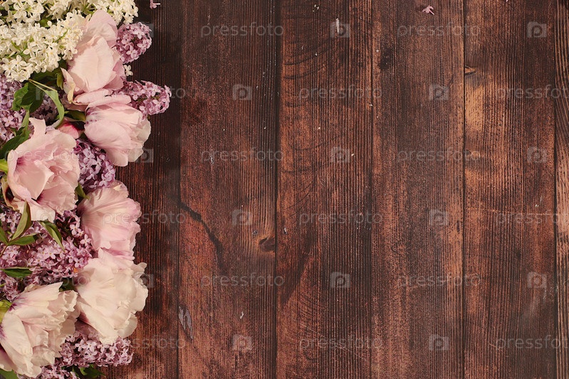 Красивые весенние цветущие ветви сирени и горного пиона на солнечном фоне. Абстрактная цветочная аранжировка и баннер для экрана, Натюрморт с местом для текста, Флоральная открытка с концепцией летнего приветствия