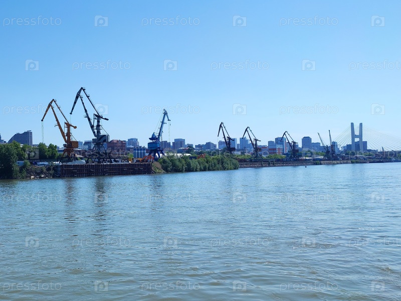 Новосибирск река Обь. Вид на портовые краны в порту. Новосибирская река Обь. Вид на портовые краны в порту. Новая Сибирь毕河。 портный крейсер с видом на порт、