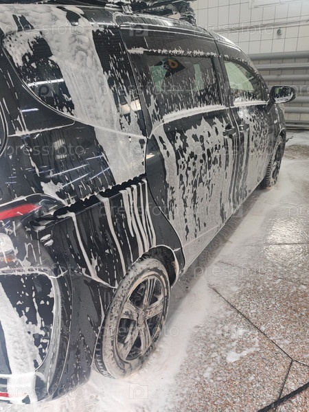 Автомобиль на автомойке покрыт пеной. Машина в автомойке покрыта пеной