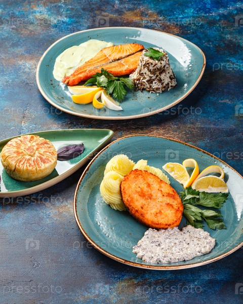 Несколько блюд из курицы, рыбы, картофеля, различных салатов и соусов