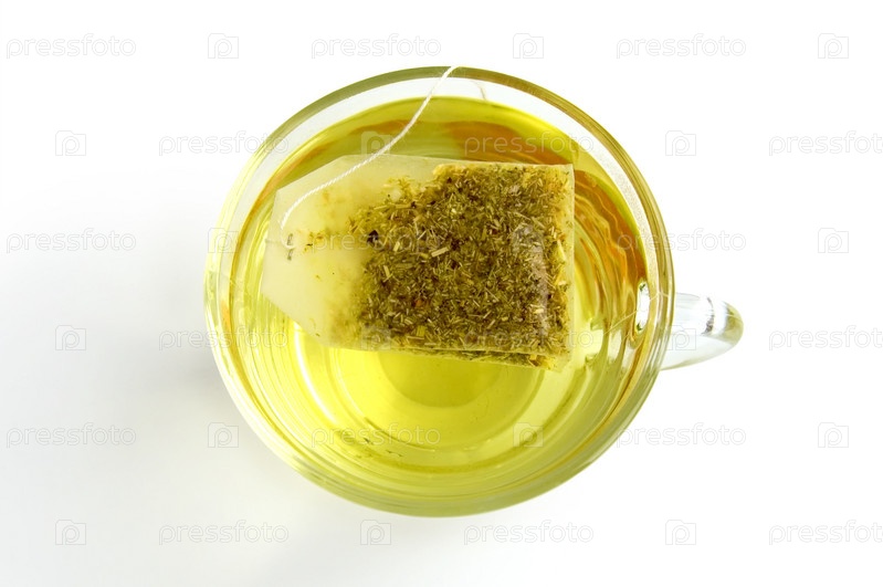 Пакетик зеленого травяного чая в стеклянной чашке с водой