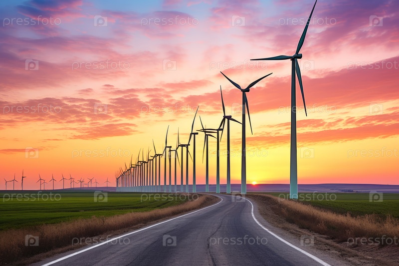 Ветропарк на закате, с рядами ветряных турбин, стоящих на фоне красочного неба