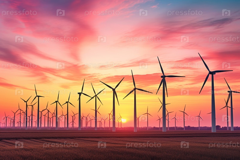 Ветропарк на закате, с рядами ветряных турбин, стоящих на фоне красочного неба