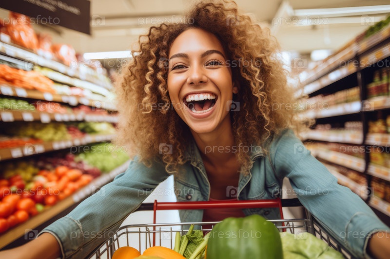 Веселая и улыбающаяся женщина-клиент, толкающая корзину со свежими продуктами вниз по проходу супермаркета, радость покупок продуктов