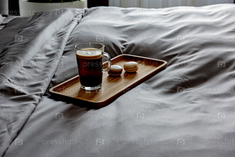 Красивое постельное белье на двухспальной кровати, Завтрак в постель