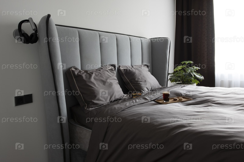 Красивое постельное белье на двухспальной кровати, Завтрак в постель