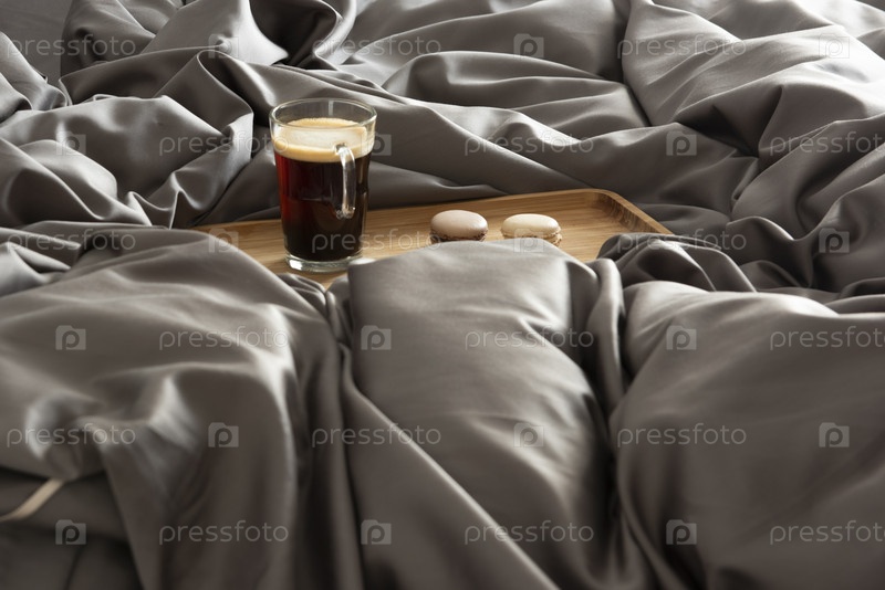 Красивое постельное белье на двухспальной кровати, Завтрак в постель