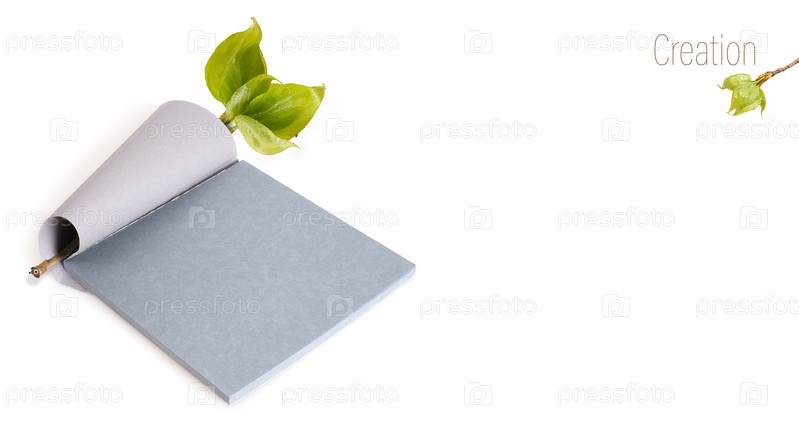 Зеленые ветви деревьев и блокнот изолированы на белом фоне. Отрицательный состав пространства