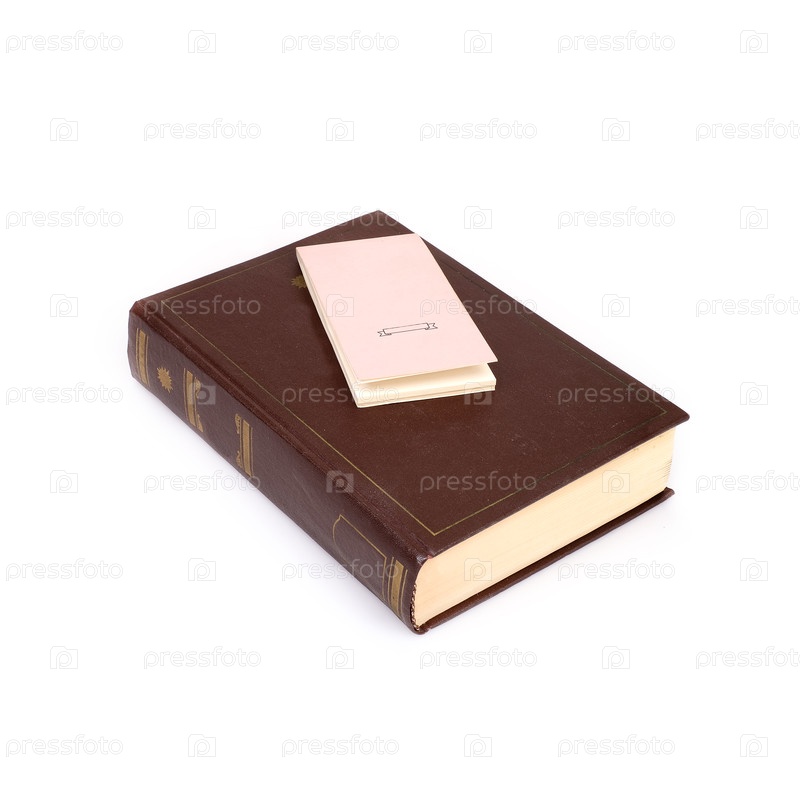 Книга в коричневой обложке и тетрадь с белыми листами, изолированными на белом фоне
