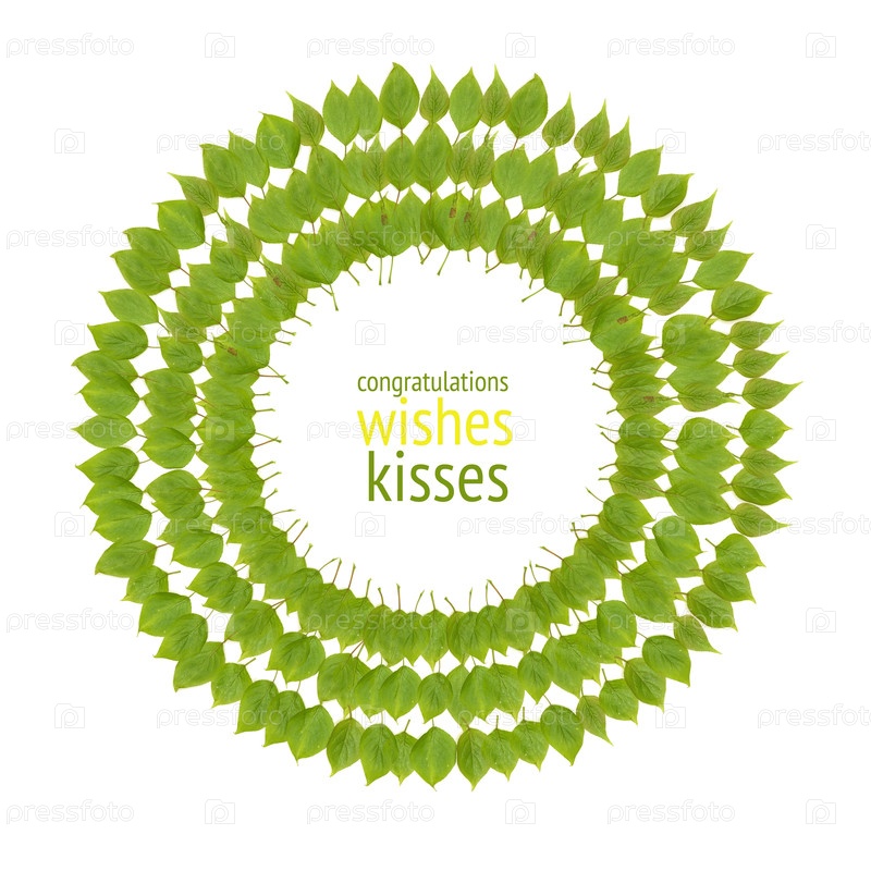 Шаблон поздравительной открытки с рисунком зеленых листьев и место внутри круга для надписи