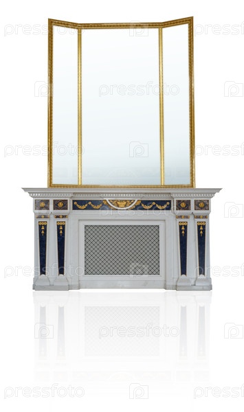 Мраморный камин с золотыми украшениями и зеркалом, изолированным на белом фоне