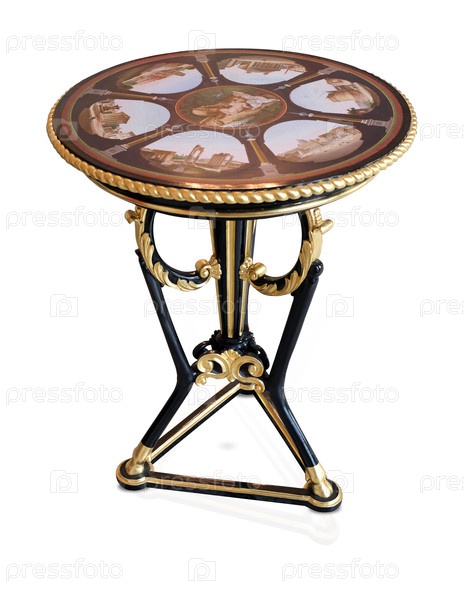 Круглый классический золотой стол на одной ноге изолирован на белом фоне. Элемент дизайна с обрезкой пути