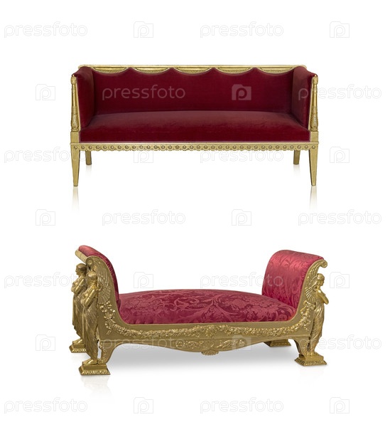 Древние золотые диваны изолированы на белом фоне
