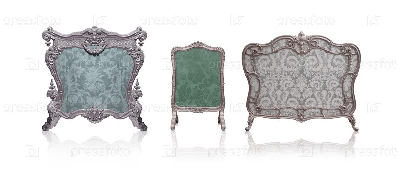 Набор серебряных огненных экранов и камина изолирован на белом фоне