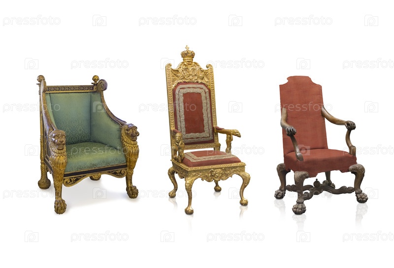 Набор древних золотых кресел, изолированных на белом фоне