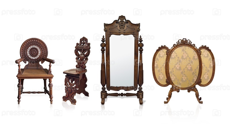 Деревянный экран огня, деревянное зеркало и деревянные стулья изолированы на белом фоне