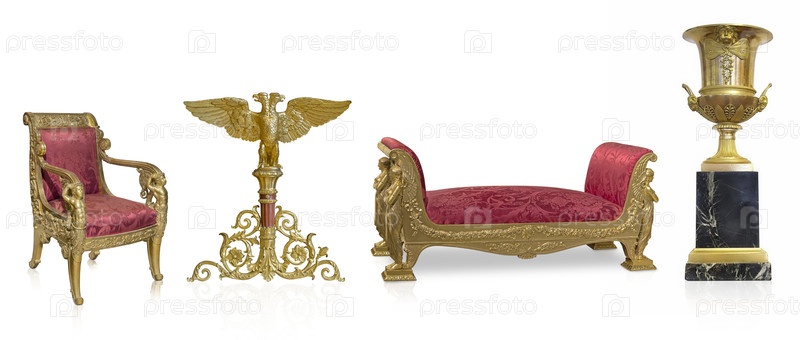Ваза с золотым стулом и диван изолированы на белом фоне