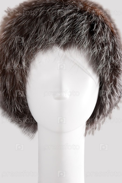 Манекеновая голова с меховой шляпой изолирована на сером фоне