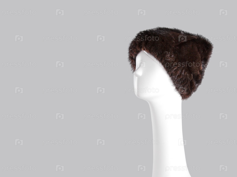 Манекеновая голова с меховой шляпой изолирована на сером фоне