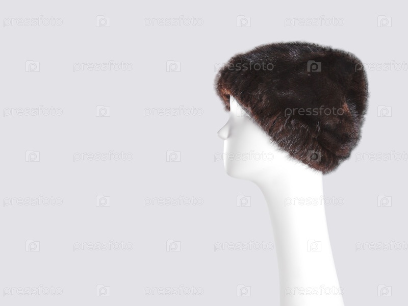 Манекеновая голова с меховой шляпой изолирована на сером фоне
