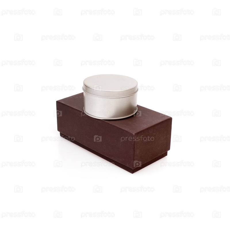 Коричневая картонная коробка и круглая металлическая коробка изолированы на белом фоне