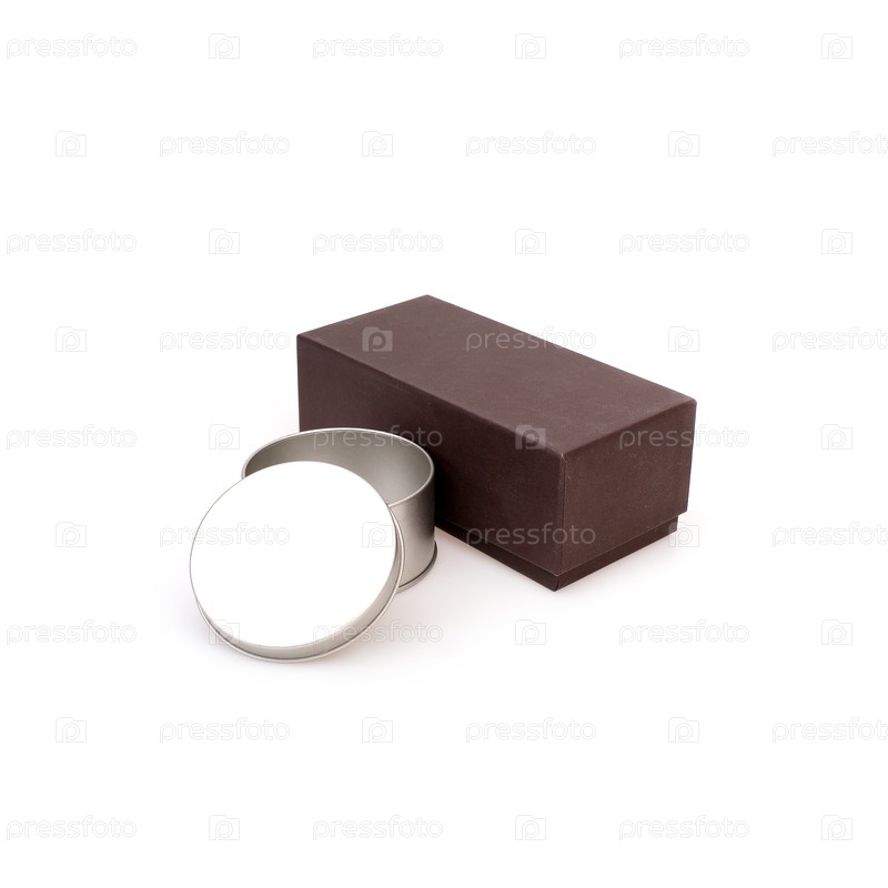 Коричневая картонная коробка и круглая металлическая коробка изолированы на белом фоне
