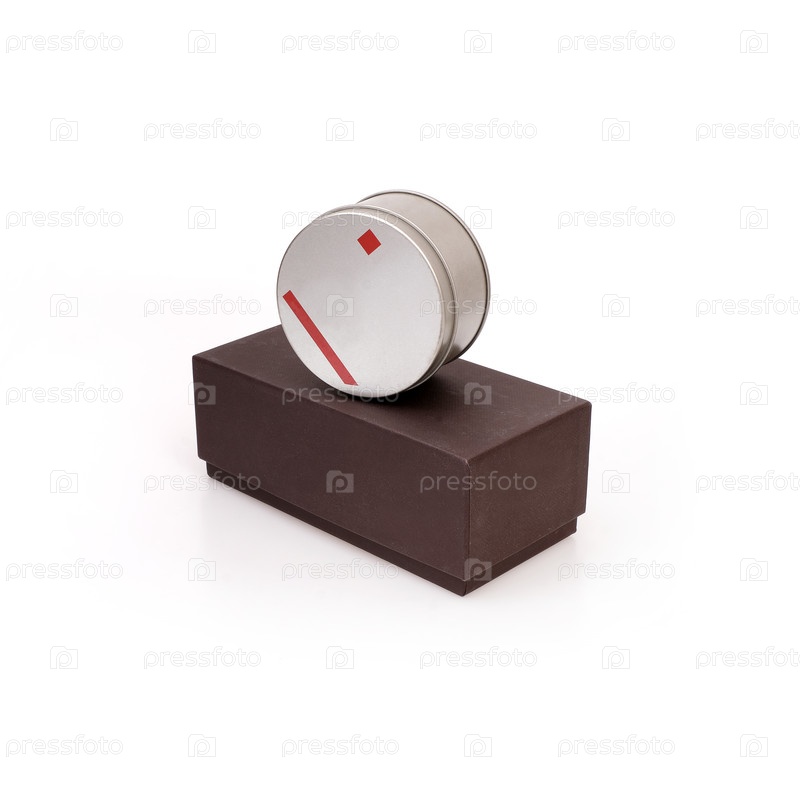 Коричневая картонная коробка и круглая металлическая коробка изолированы на белом фоне