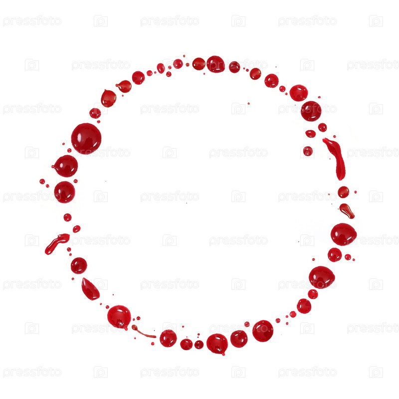Круглый макет рамы: Капли красной жидкости (кровь, лак для ногтей, кетчуп, повязка) изолированы на белом фоне