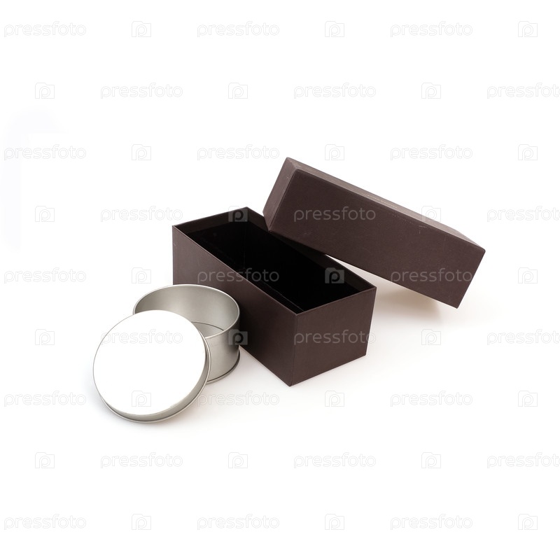 Коричневая картонная коробка и круглая металлическая коробка изолированы на белом фоне