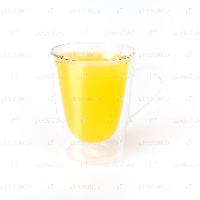 Стеклянная кружка с натуральным апельсиновым соком выделена на белом фоне