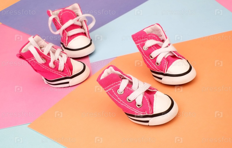 Забавные розовые кроссовки для маленьких собак на цветном фоне