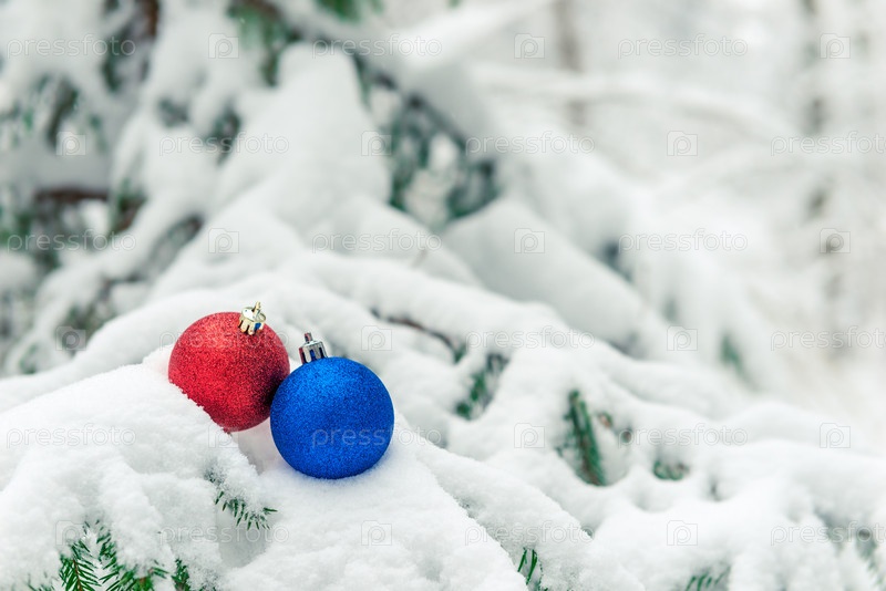 Елочные ветки в лесу покрыты снегом с игрушечными шариками. Концепт нового года