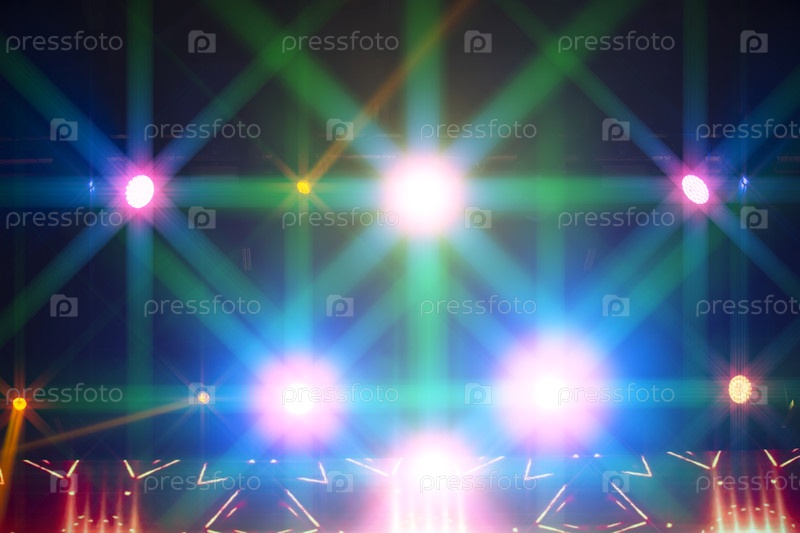 Яркие многоцветные радужные огни сценического освещения. Сцена, выступление. Концертный свет