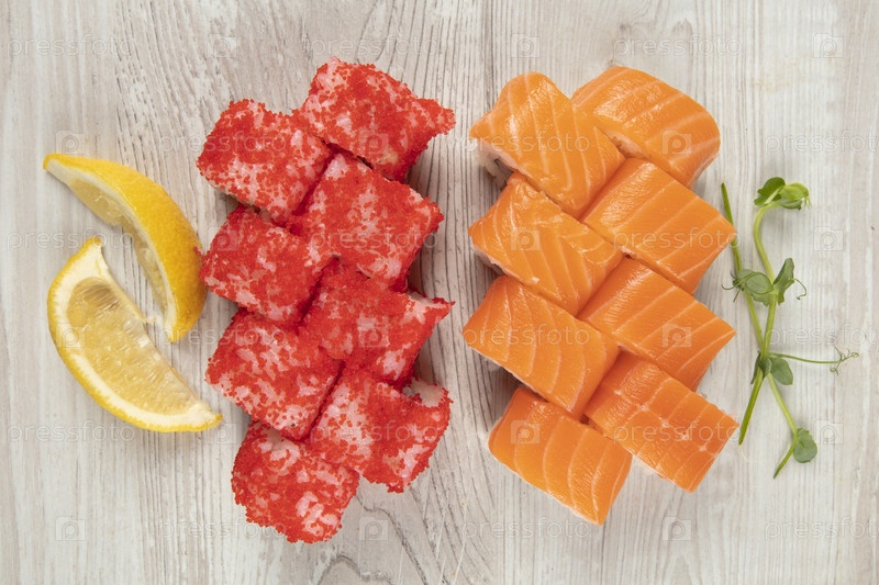 Набор различных суши-роллов на белом деревянном фоне. Японская еда