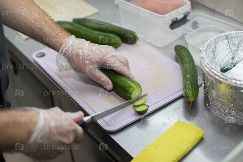 Шеф-повар режет огурец суши или салатным ножом