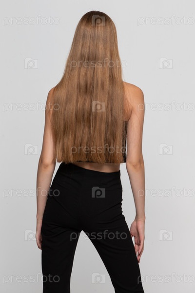 Красивая девушка показывает свои длинные светлые волосы. Вид сзади