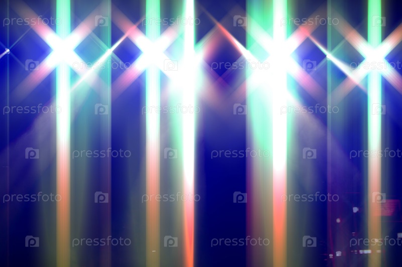 Яркое праздничное многоцветное сценическое освещение с оптическими вспышками и лучами от осветительных ламп