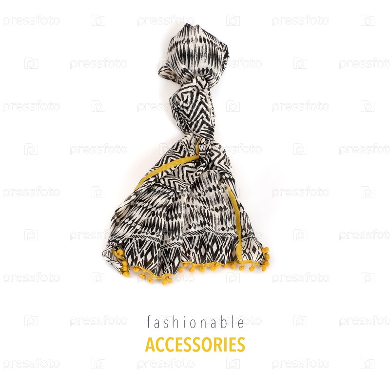 Красивый шарф с геометрическим черно-белым рисунком и желтыми кисточками, выделенными на белом фоне для обрамления этикеток, объявлений и фотографий